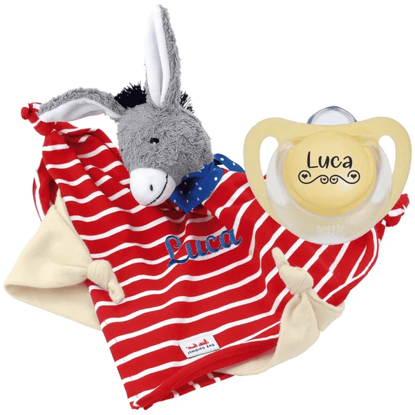 Schnullireich Geschenkset Käthe Kruse Schmusetuch Mit Namen Esel + NUK Namensschnuller (0-6 Mon) Rot